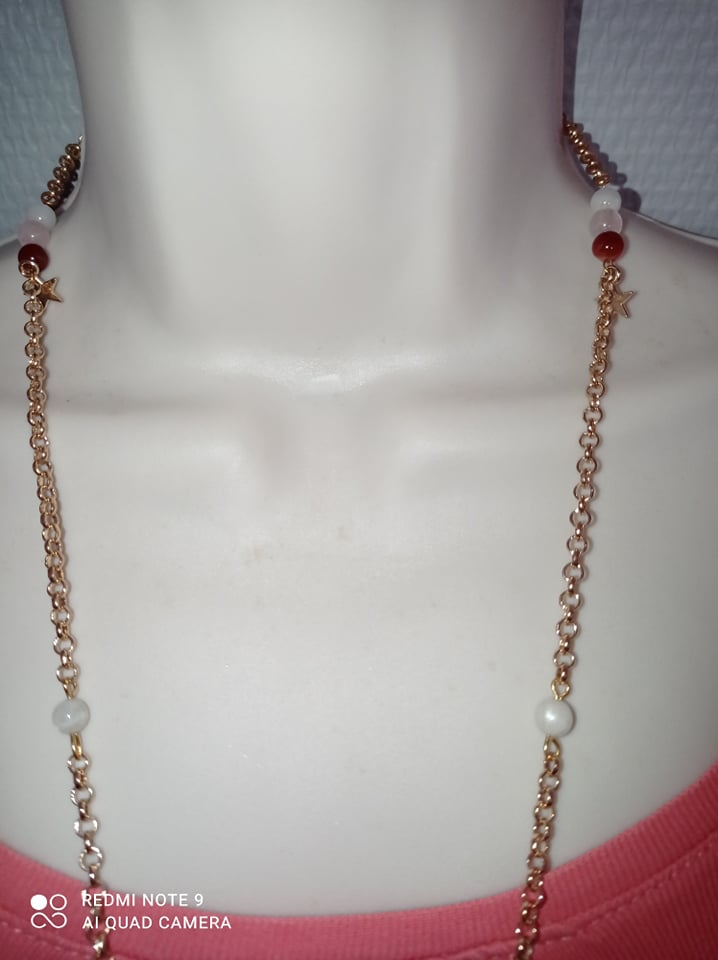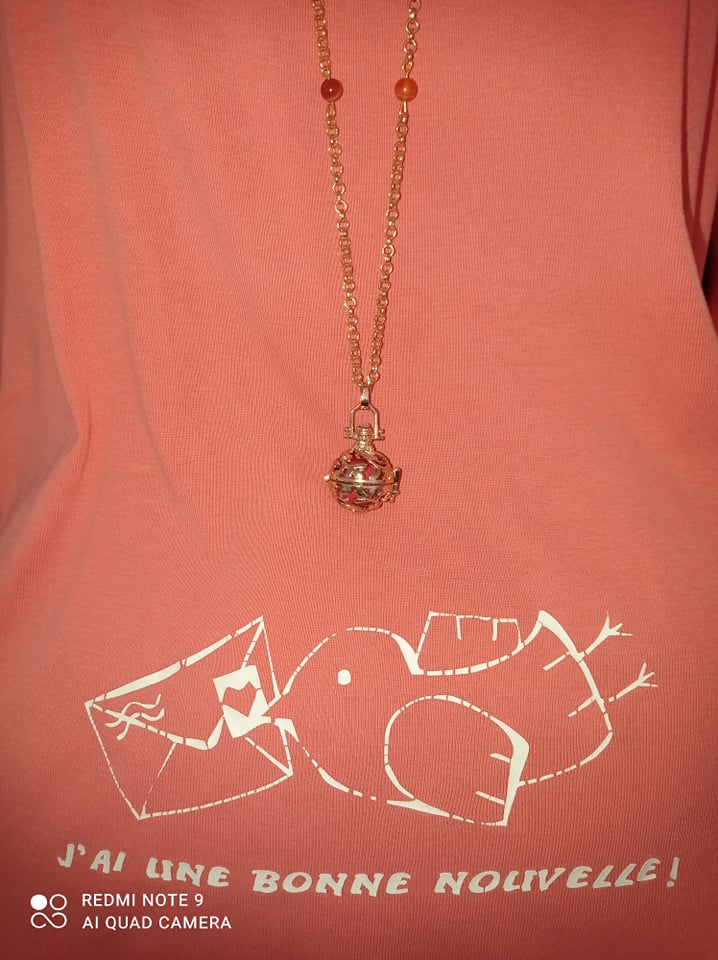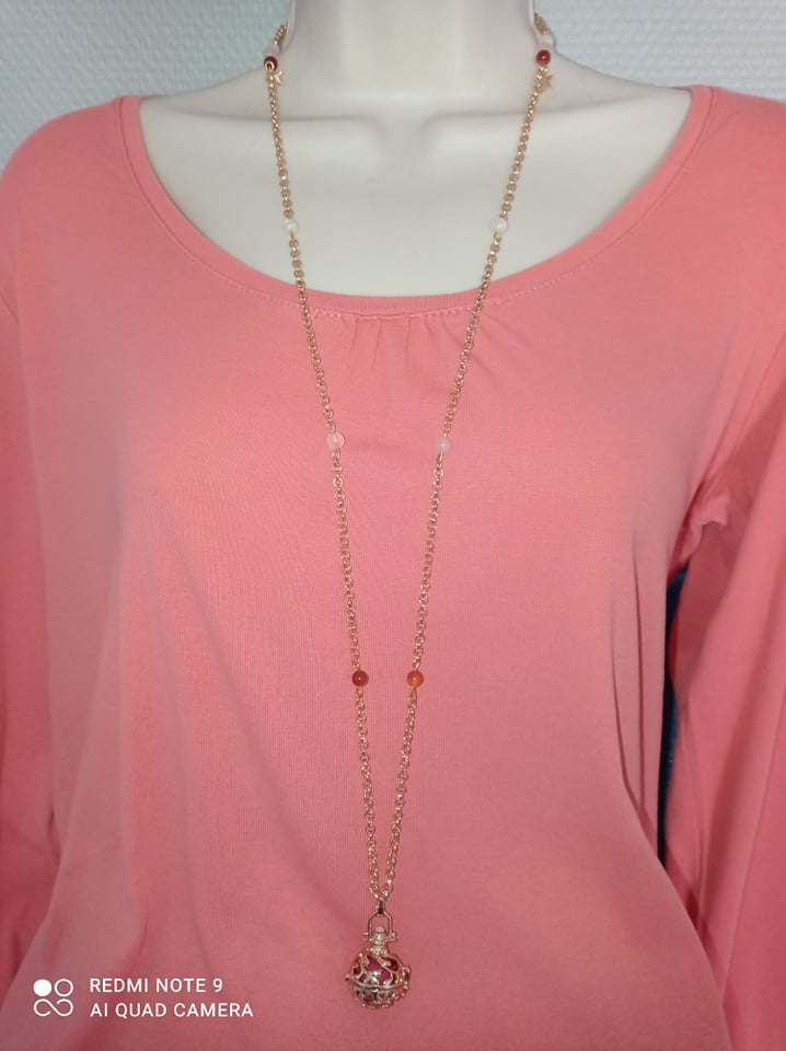 Bola de grossesse : feuilles en 18mm, couleur dorée. Il est vendu avec une perle sonore de couleur rouge de 16mm. Il est agrémenté de pierres gemmes en pierre de lune, cornaline et quartz rose. J’y ai rajouté des pendentifs étoiles