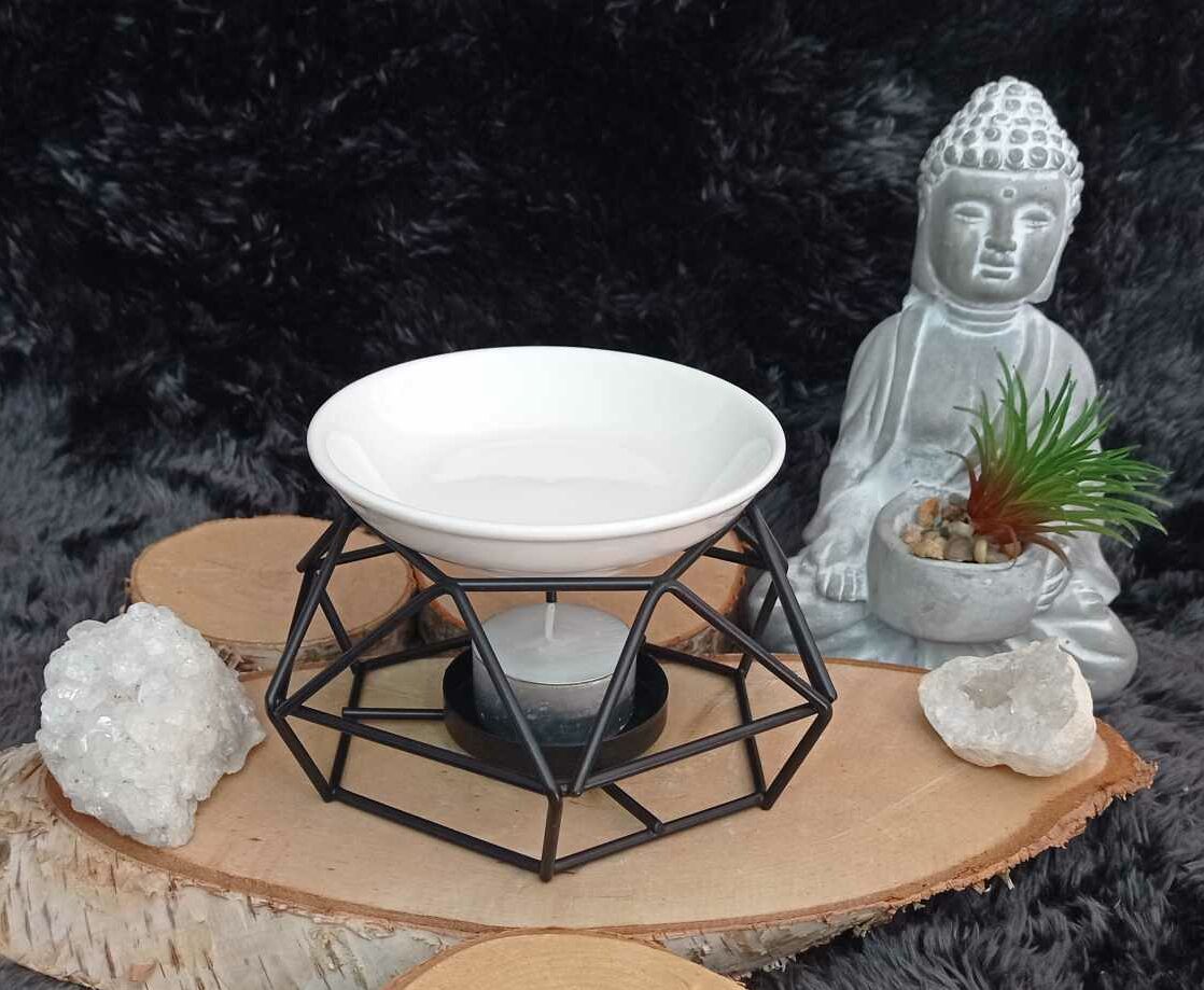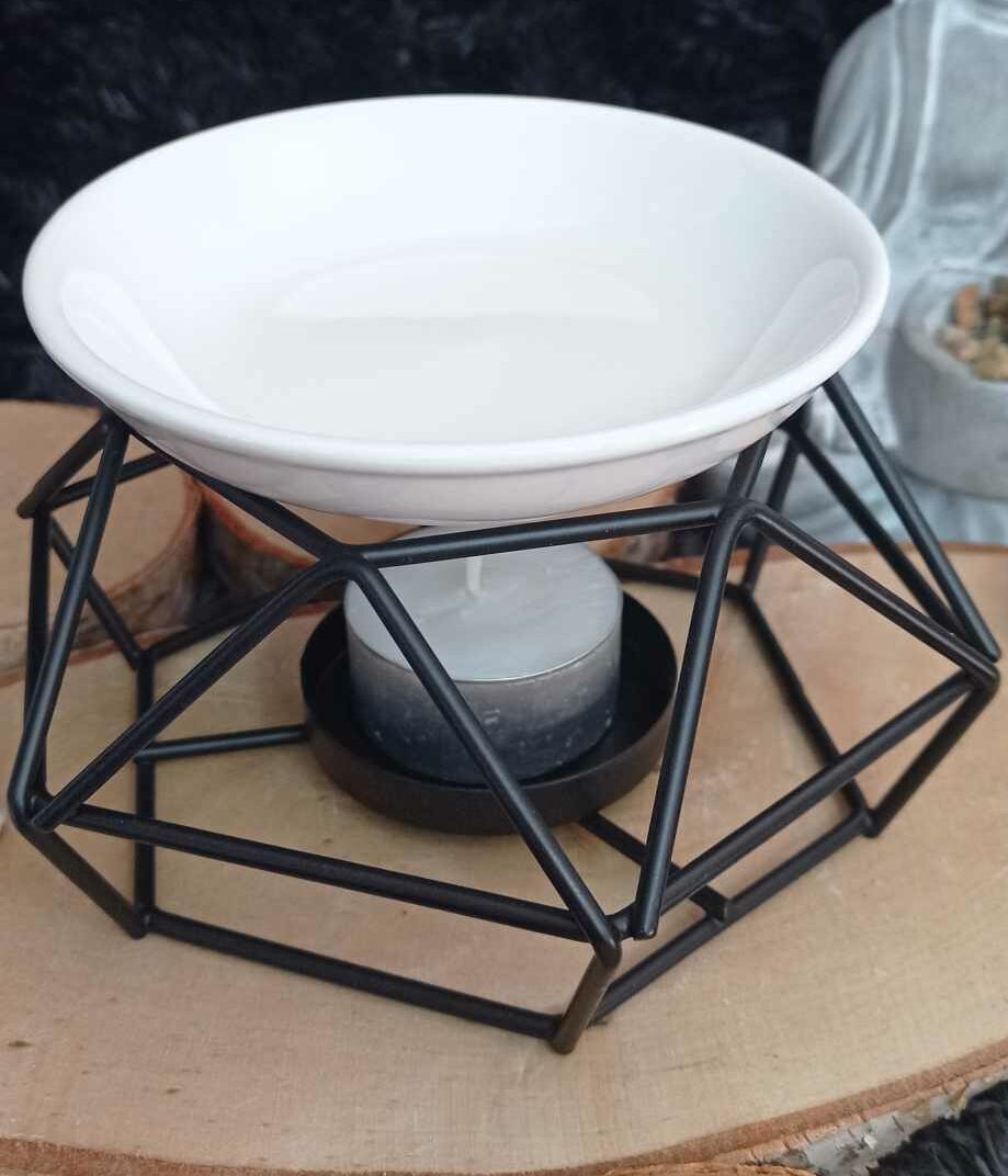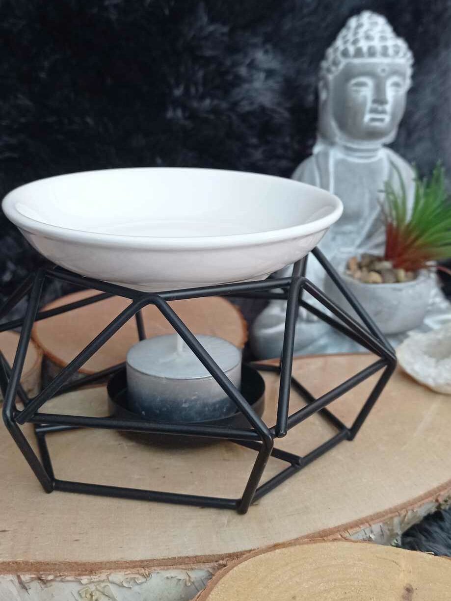 Brûleur moderne en métal noir et coupelle en céramique blanche.
